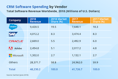 As per the recent reports conducted by Gartner on CRM market , SalesForce CRM is still achieving top most position acquiring 19.5 % of CRM market share . SAP as per recent reports is acquiring only 8.3 % of the total market share .